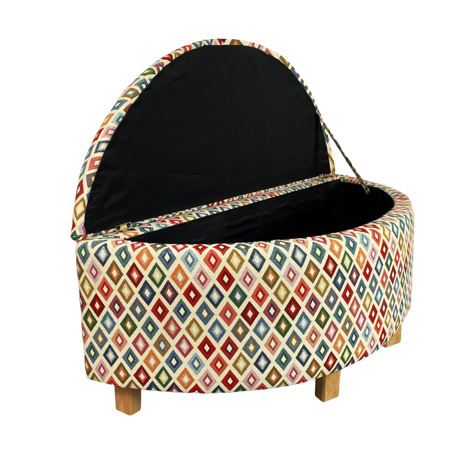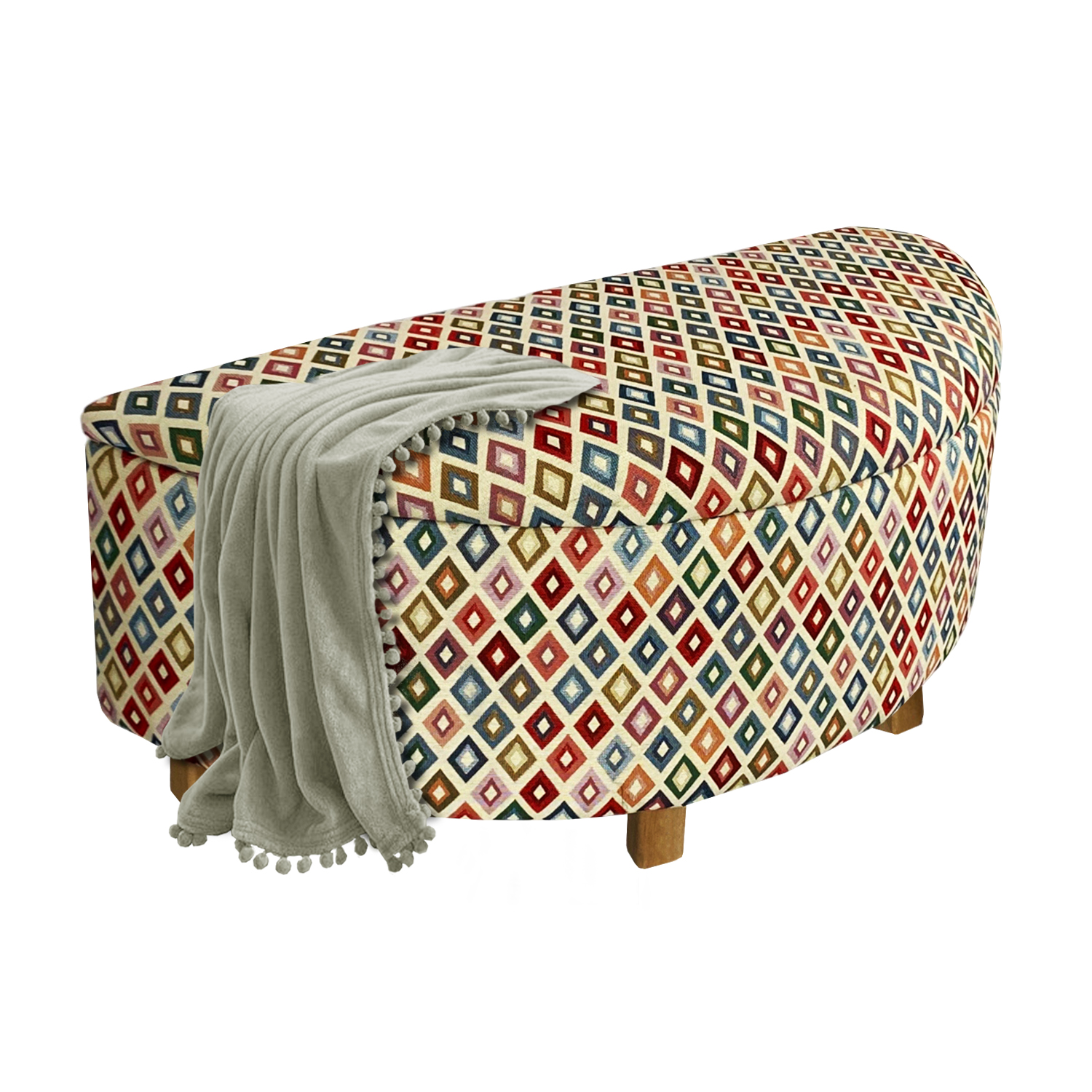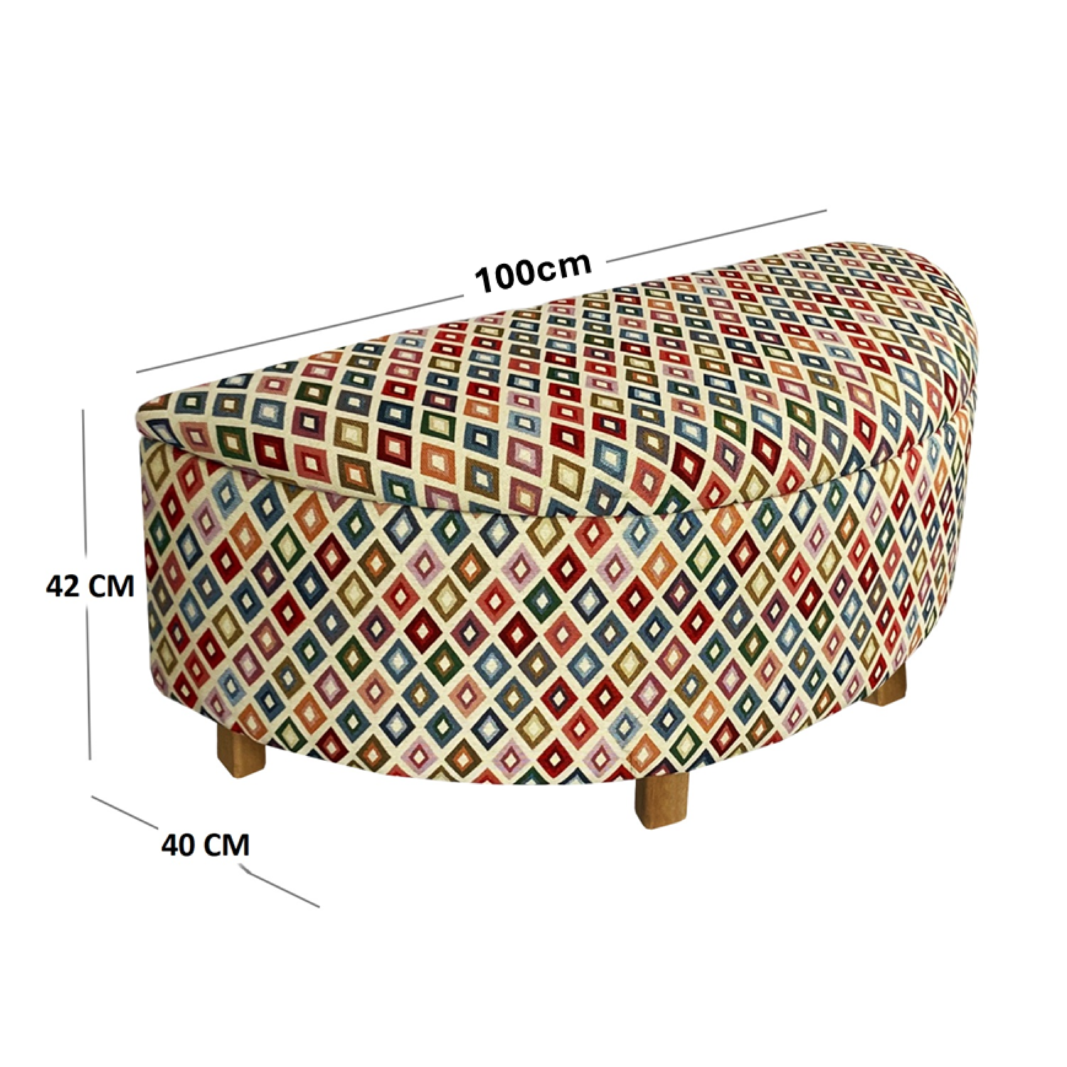 Puff Tipo Banqueta Baúl Media Luna gobelino Sucre, estructura en madera natural, espuma de alta densidad, con patas en madera color natural.