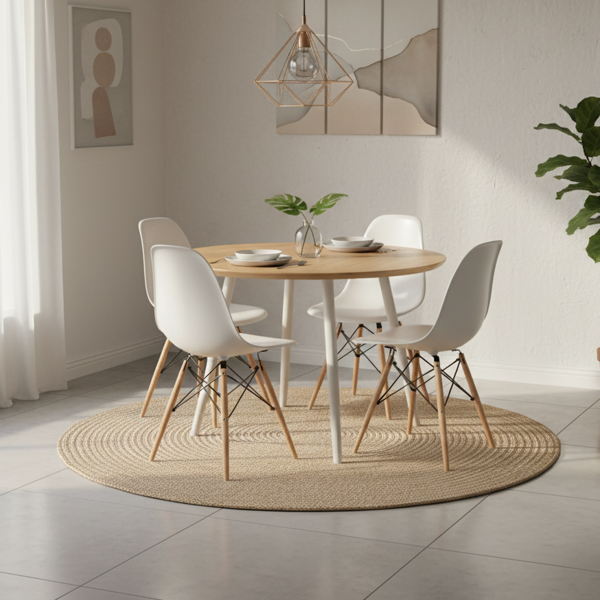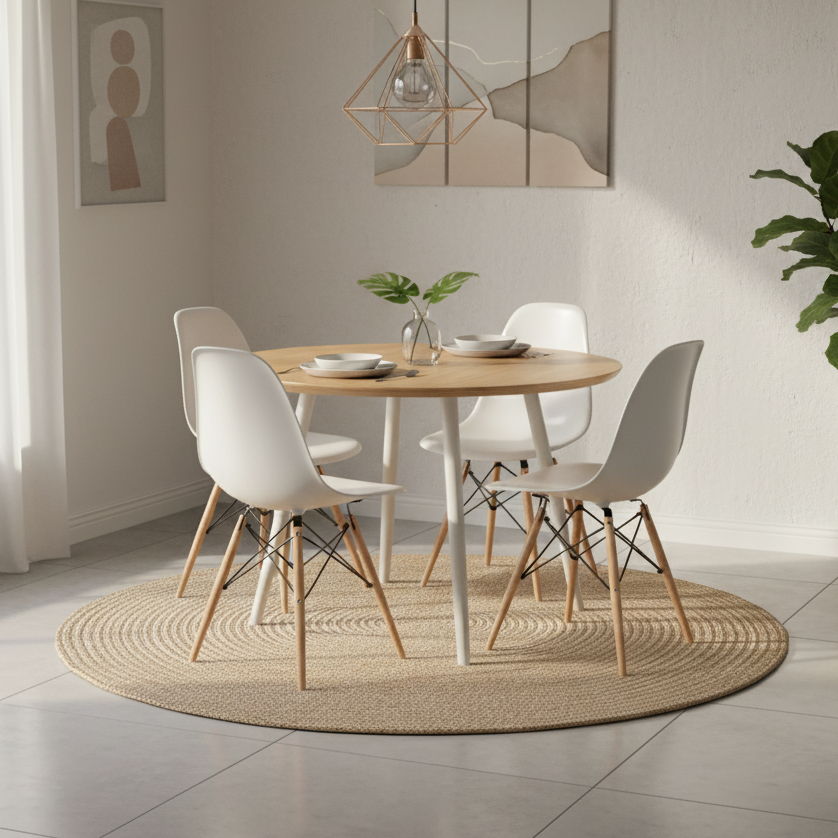 Combo Comedor Redondo Like en color Blanco Vienes, fabricado en melamina con protección antimicrobiana al 99,9%, equipadas con niveladores que garantizan estabilidad en todo tipo de superficie. Incluye un set de 4 sillas con estructura en polipropileno, patas metálicas con pintura electrostática y diseño moderno que combina confort y durabilidad. Ideal para espacios contemporáneos que buscan estilo, funcionalidad y fácil mantenimiento.