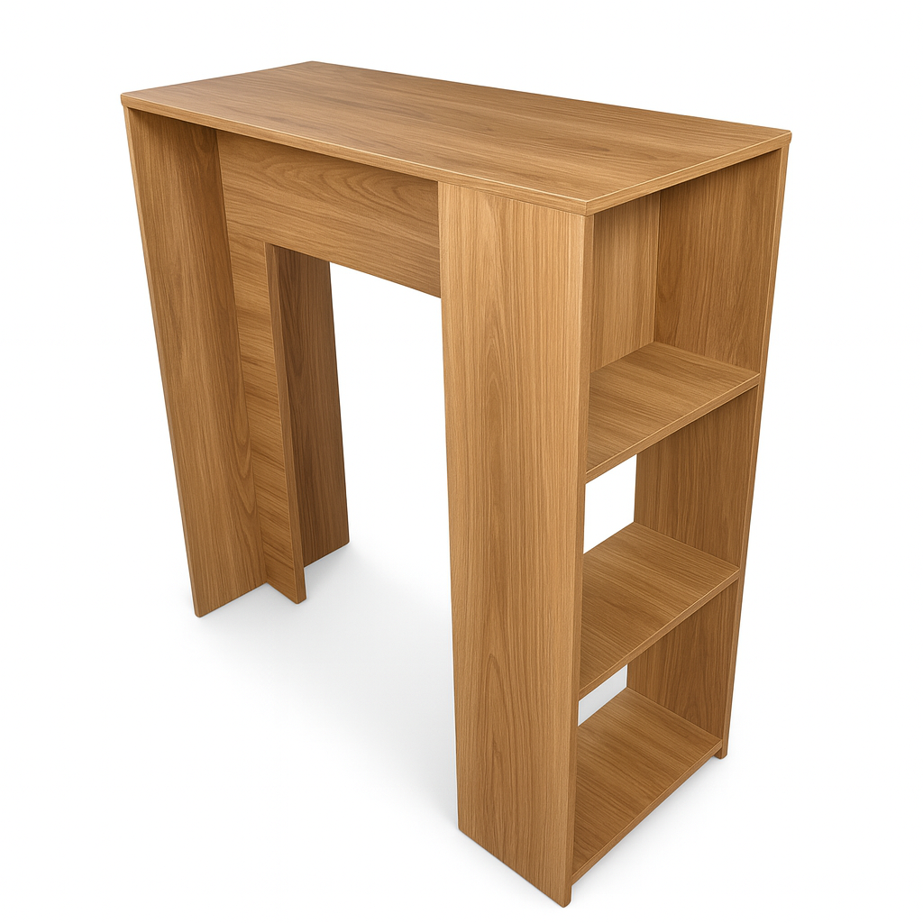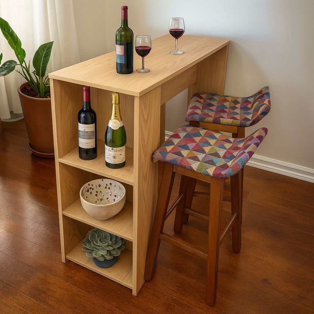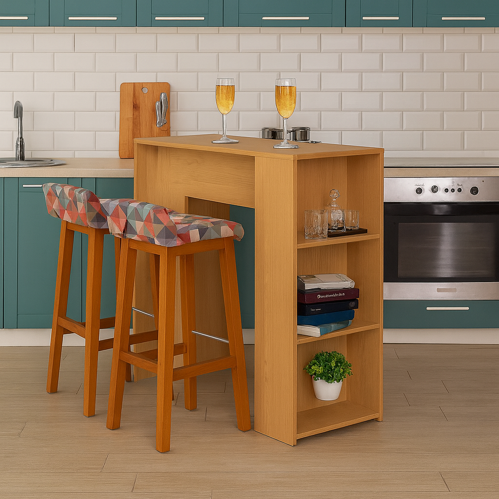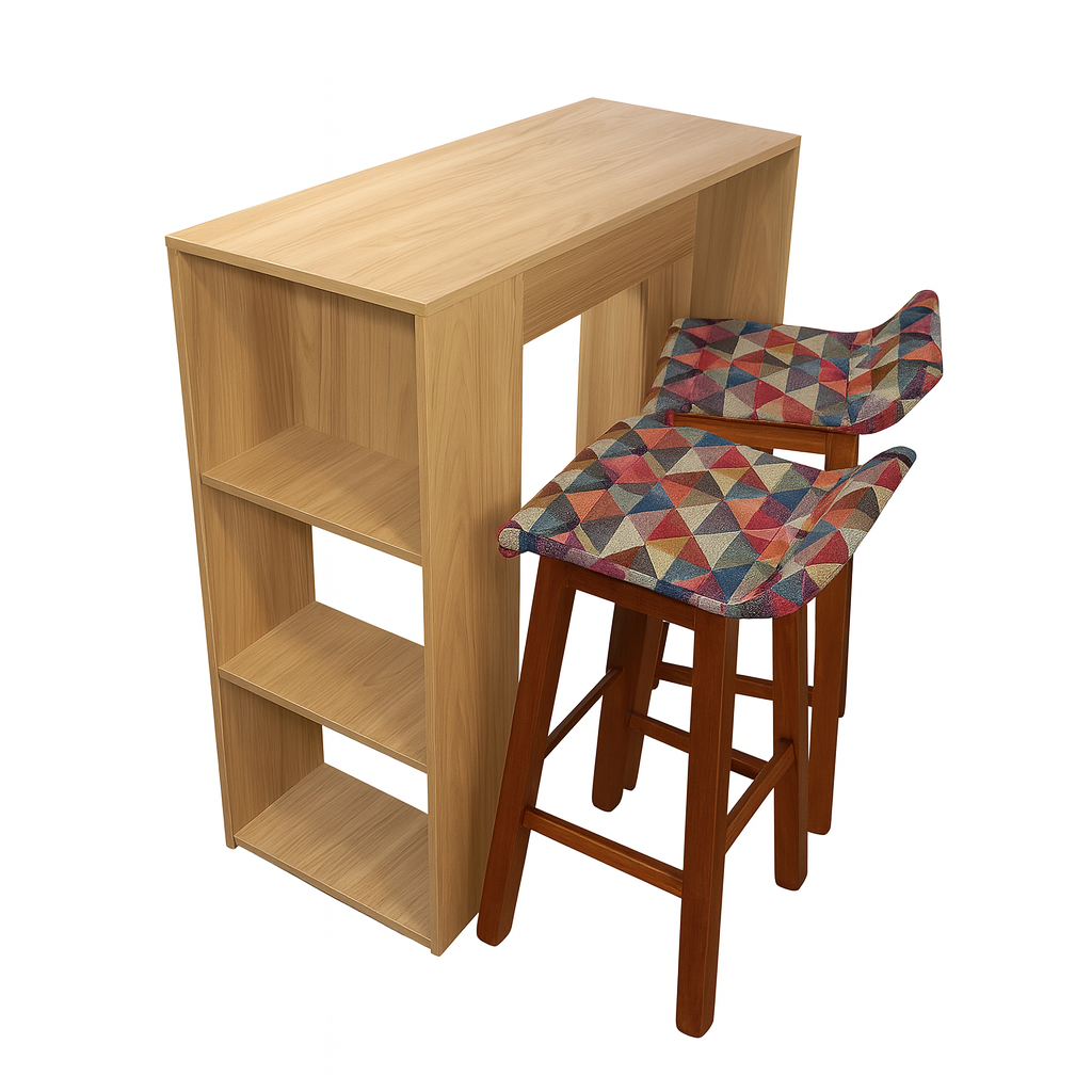 Combo Barra Auxiliar de Cocina Madrid en color Fresno, fabricada en melamina de 15 mm con protección antimicrobiana al 99,9%, cuenta con repisas laterales que brindan espacio adicional para organizar. Incluye 2 sillas tipo bar en madera natural, tapizadas en tela Gobelino Colors, que aportan diseño, confort y un toque decorativo único.