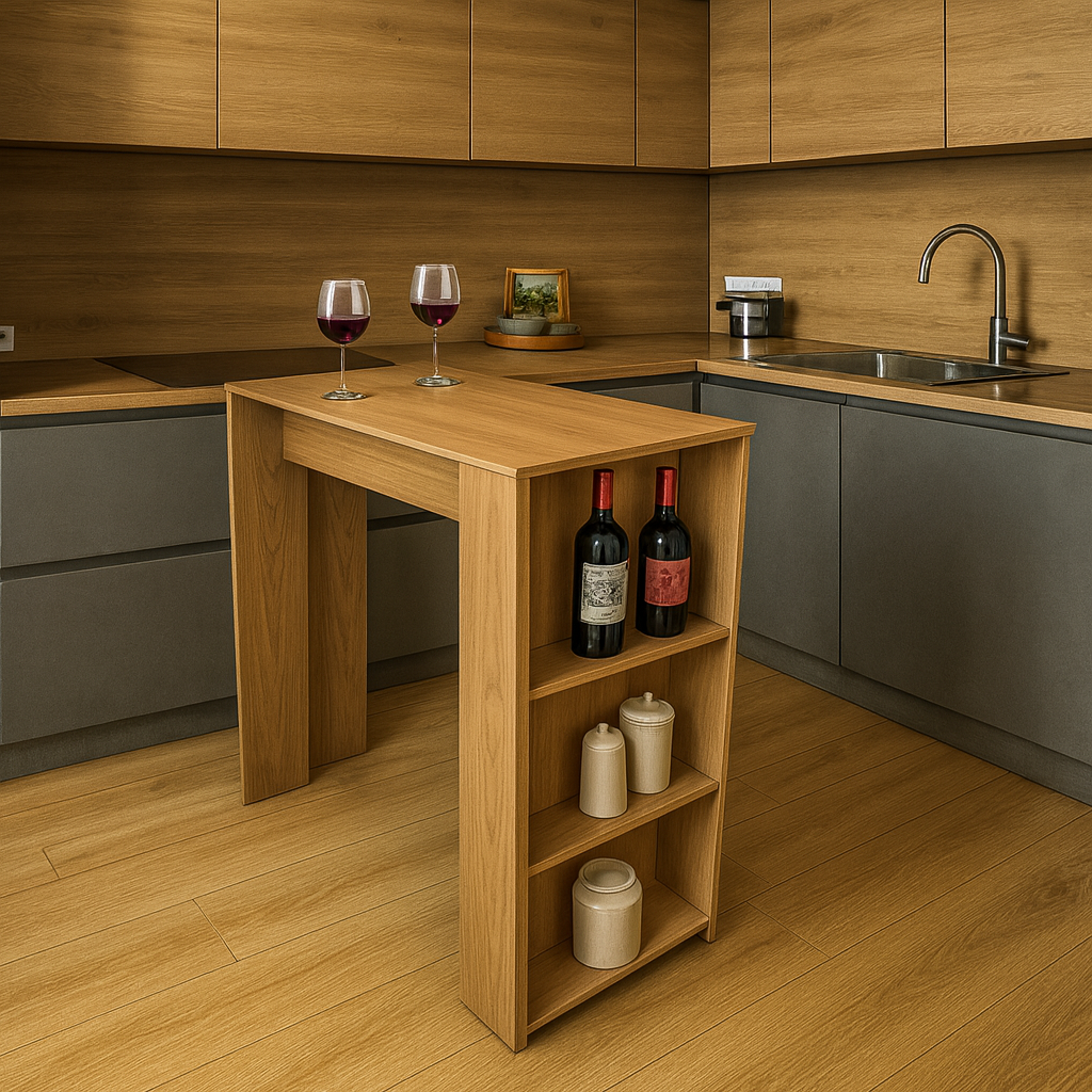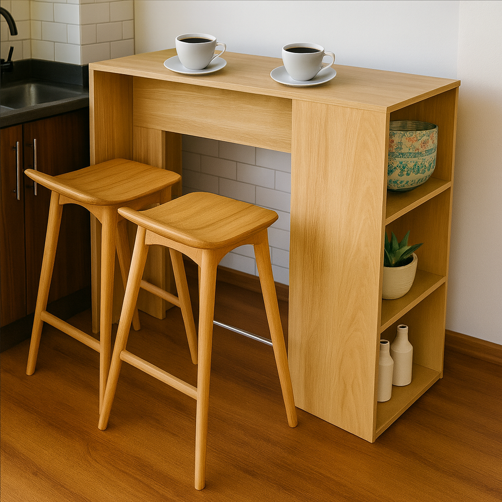 Combo Barra Auxiliar de Cocina Madrid en color Fresno, fabricada en melamina de 15 mm con protección antimicrobiana al 99,9%. Incluye prácticas repisas laterales para organización adicional y 2 sillas tipo bar en madera, perfectas para complementar espacios modernos con funcionalidad y estilo.