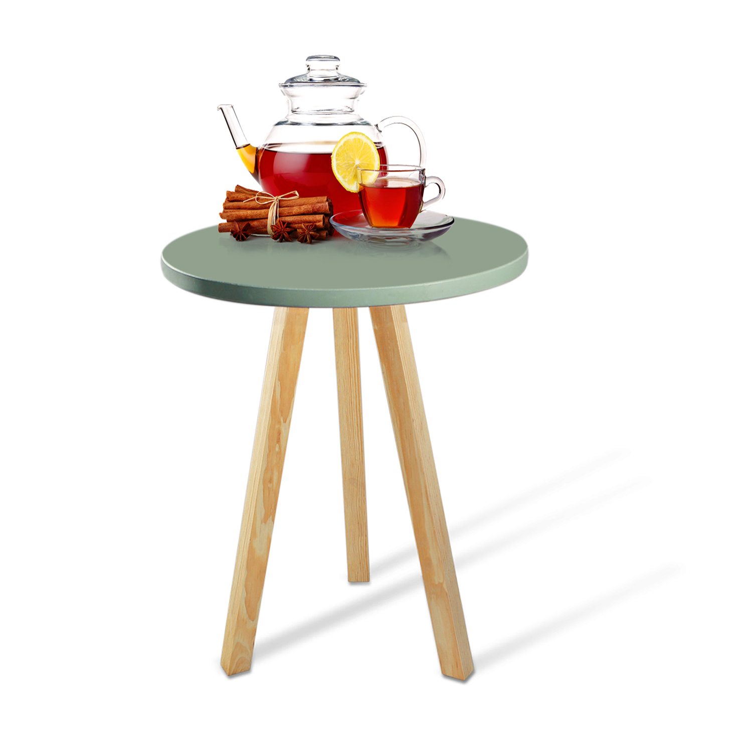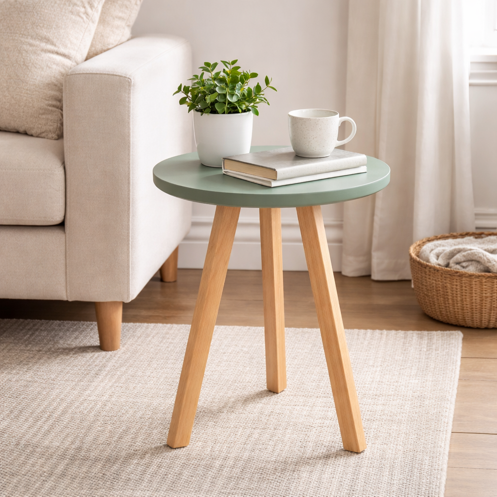Mesa Auxiliar Verde. fabricado melamina con protección antimicrobiana al 99.9% y patas en madera torneada natural