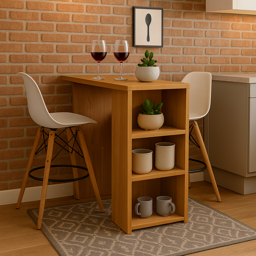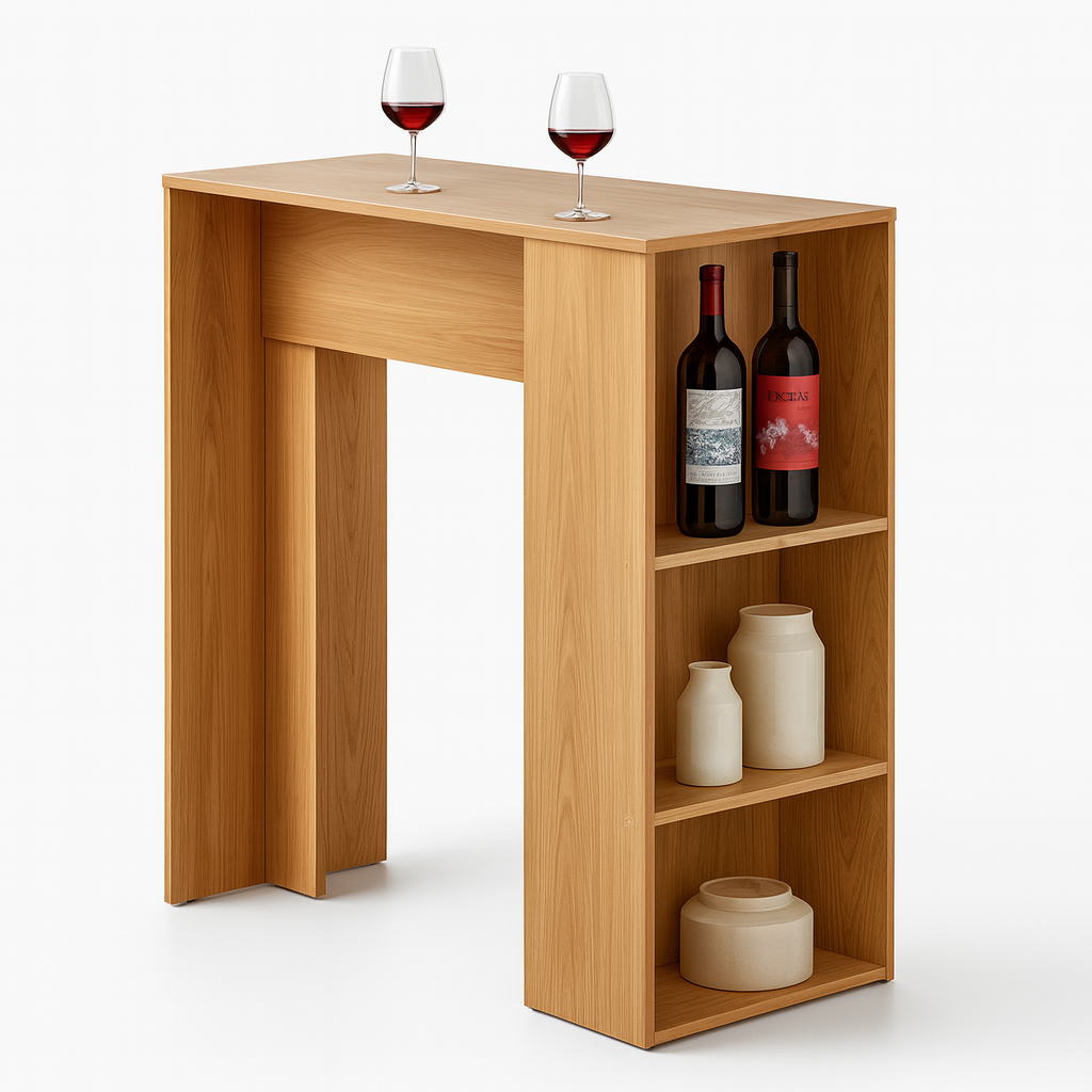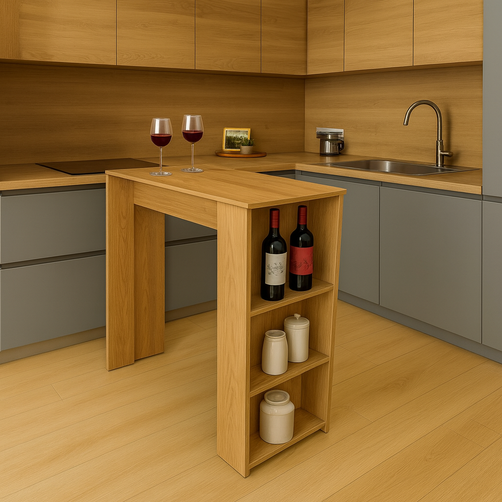 Barra Auxiliar de Cocina Madrid en color Fresno, fabricada en melamina de 15 mm con protección antimicrobiana al 99,9%. Cuenta con repisas laterales que ofrecen espacio extra para organización y almacenamiento. Ideal para optimizar espacios en tu cocina con estilo y funcionalidad.