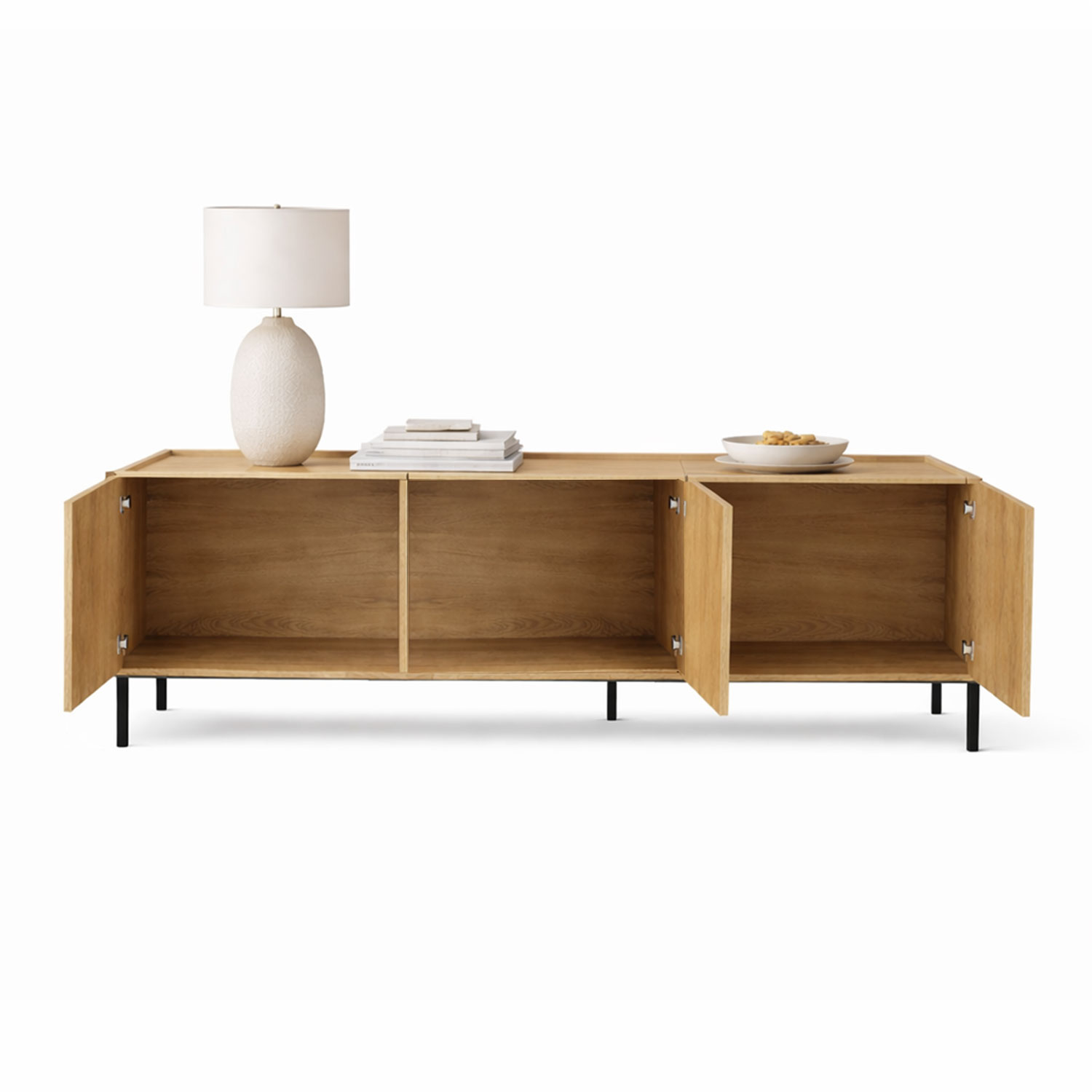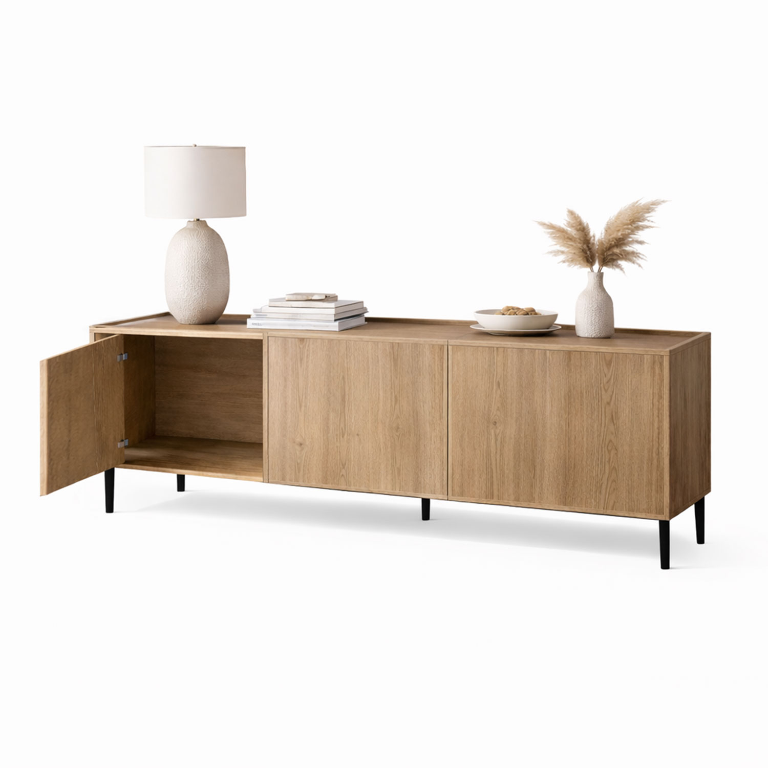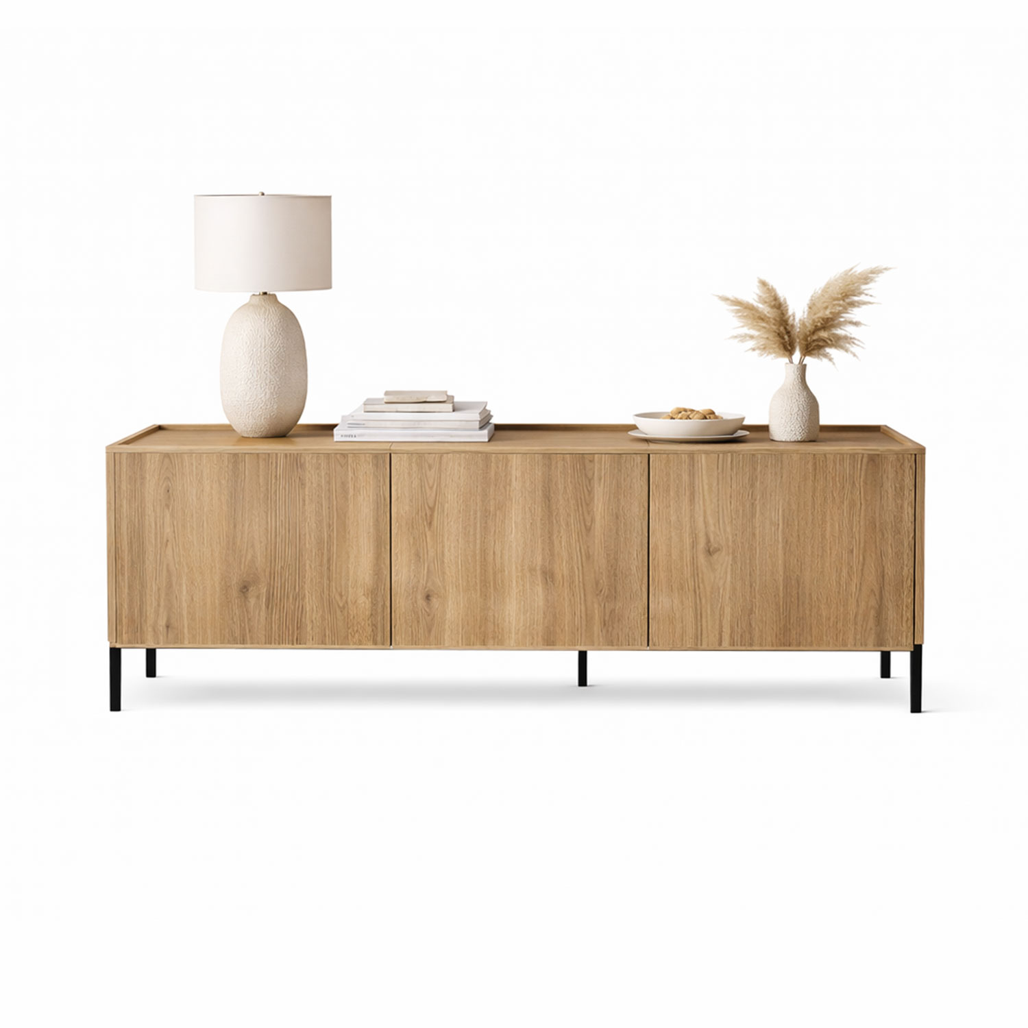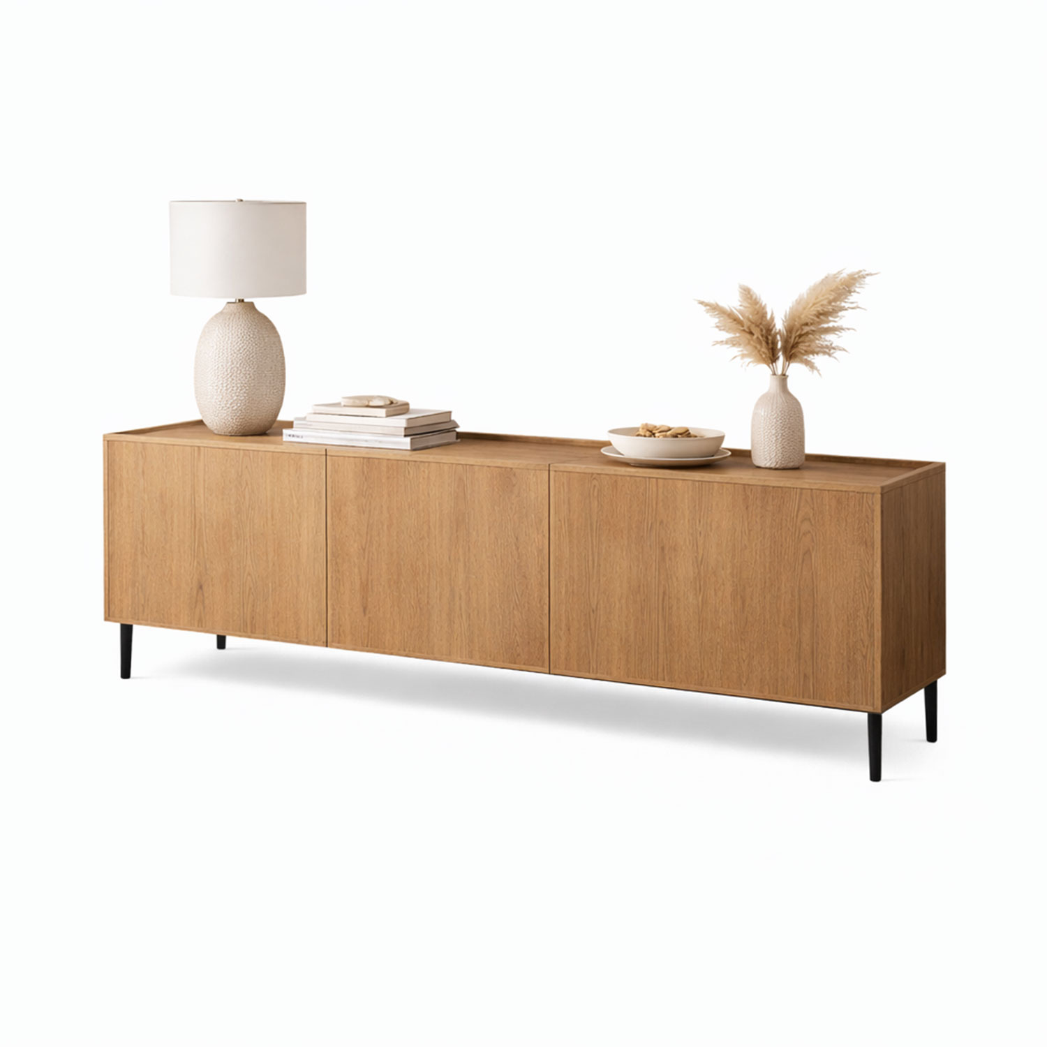 | Mueble TV en melanina 15 mm madera clara con acabado natural que resalta la veta, estructura firme y resistente, con puertas que permiten almacenamiento, complementado con patas metálicas que brindan estabilidad y durabilidad.