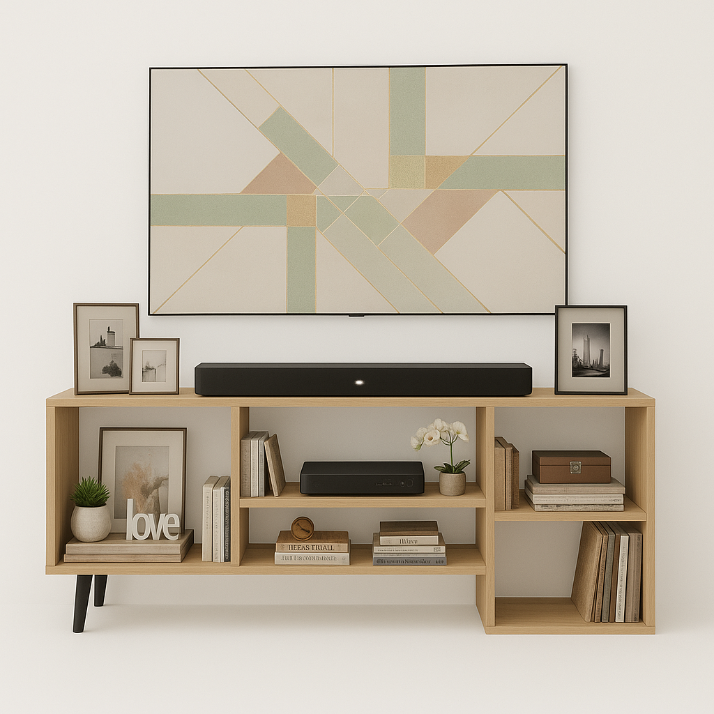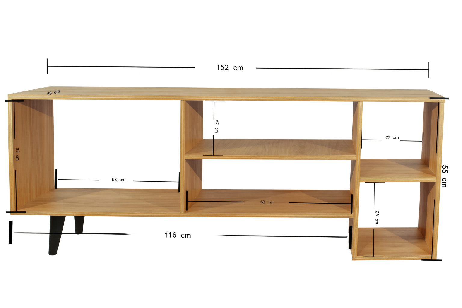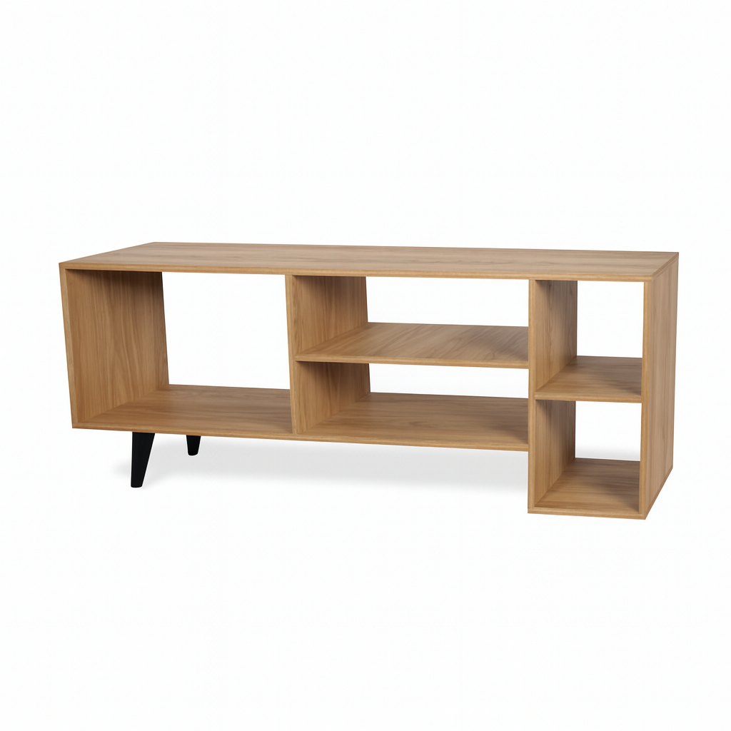 Mesa TV hasta 65″ Madrid (55X150X30) Fresno, en Melamina con protección antimicrobiana al 99.9% y patas en madera natural.