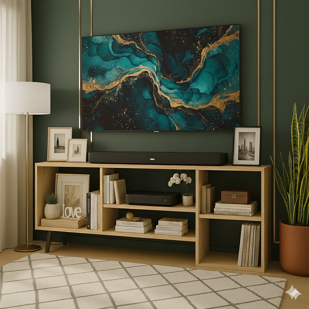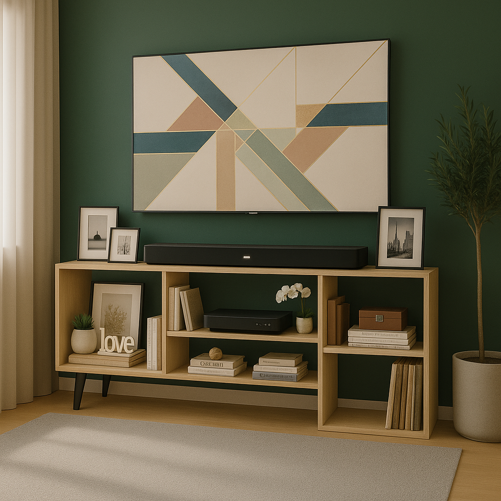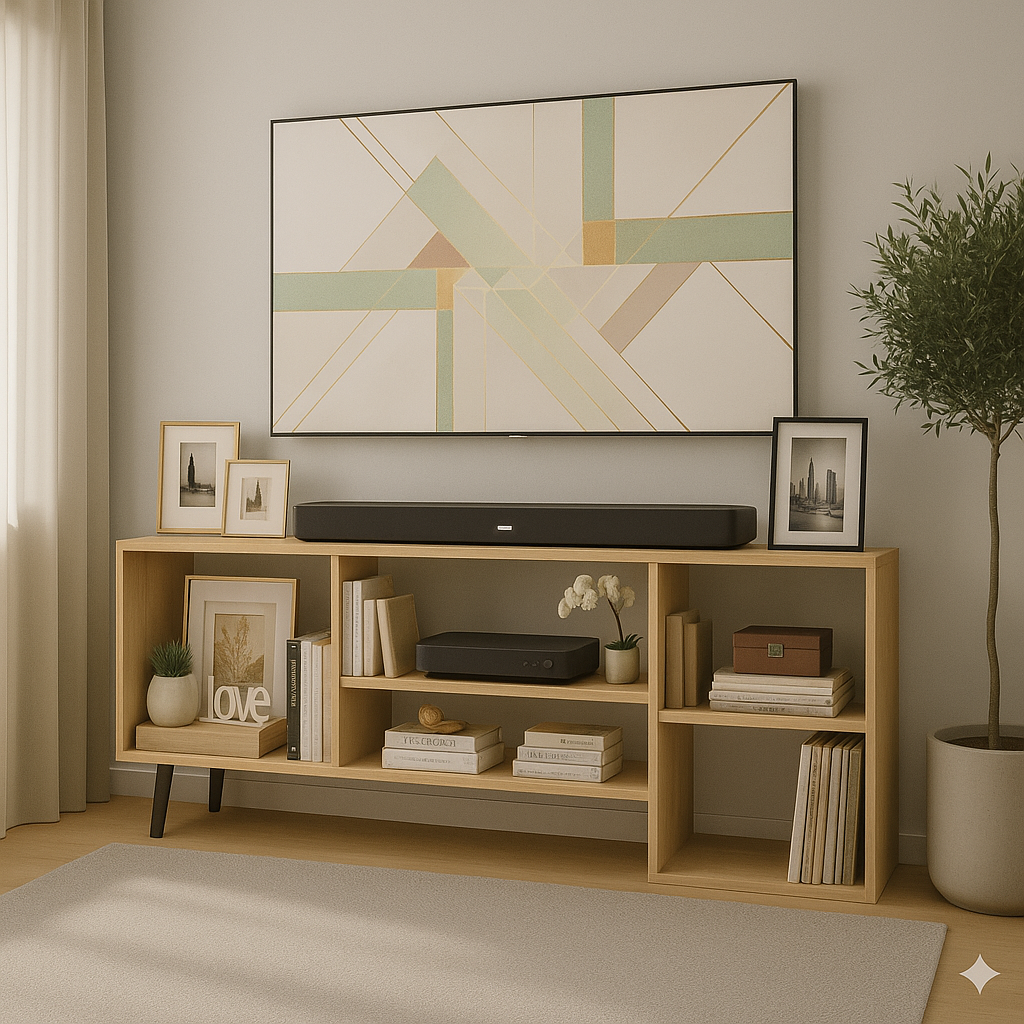 Mesa TV hasta 65″ Madrid (55X150X30) Fresno, en Melamina con protección antimicrobiana al 99.9% y patas en madera natural.