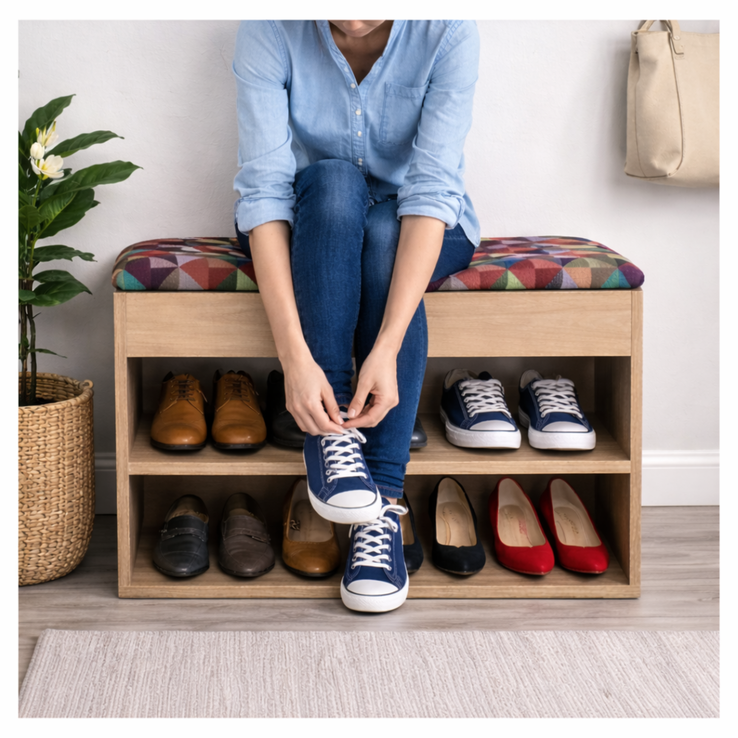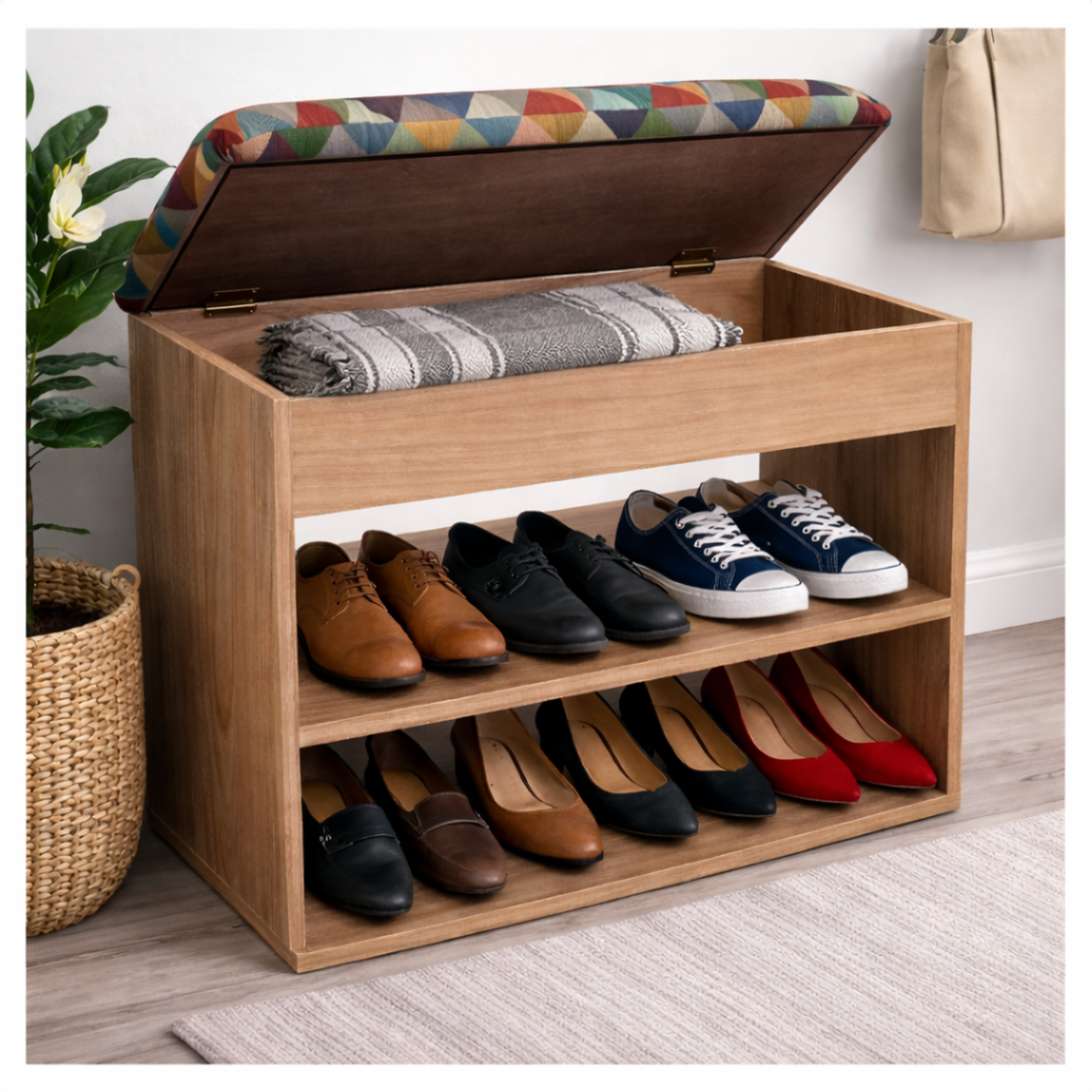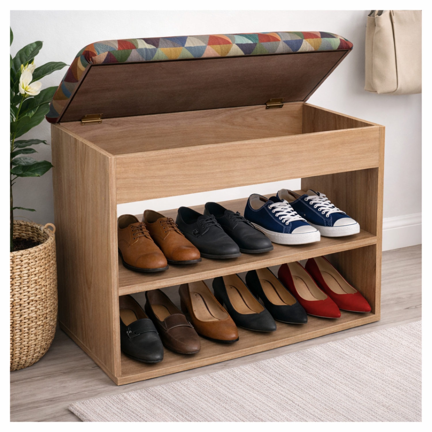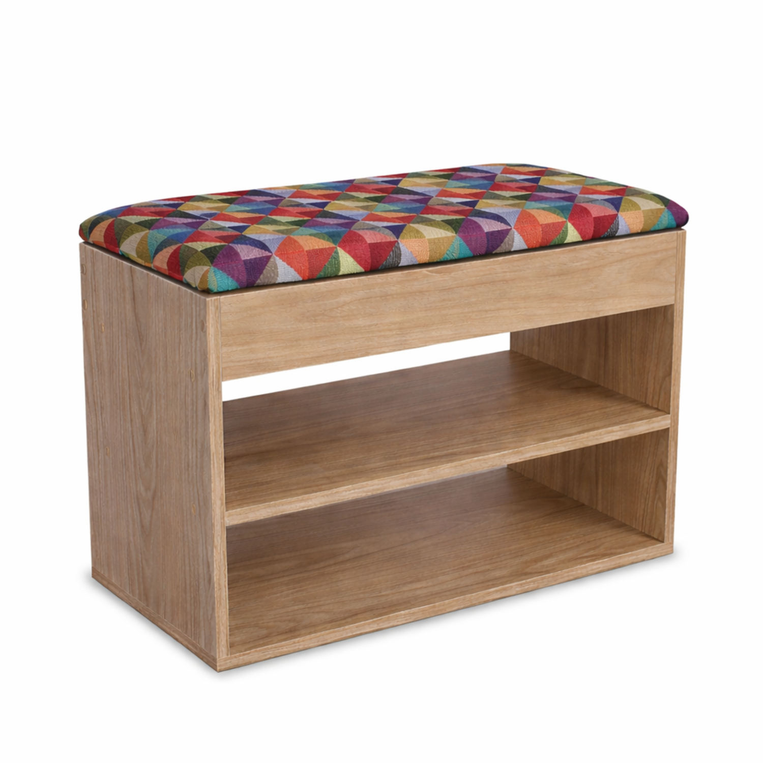 Mueble Organizador Zapatero (43x60x30) Fresno en Melamina con protección antimicrobiana 99.9%, Tapa tapizada en tela Colors gobelino