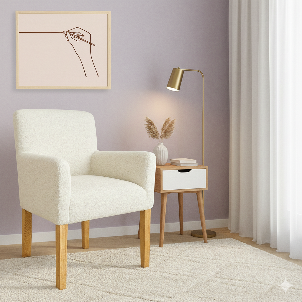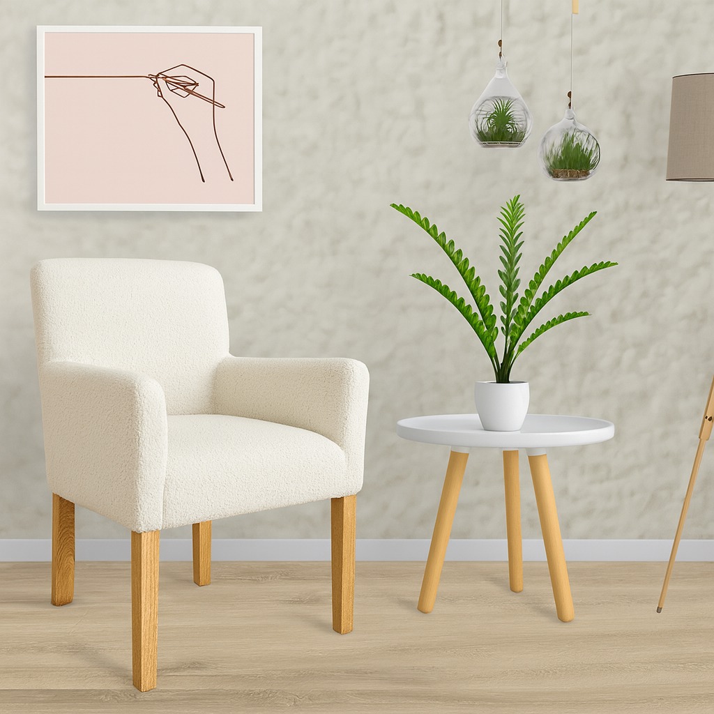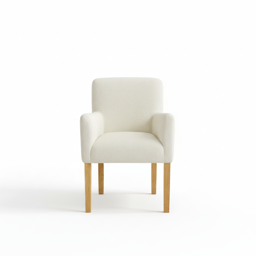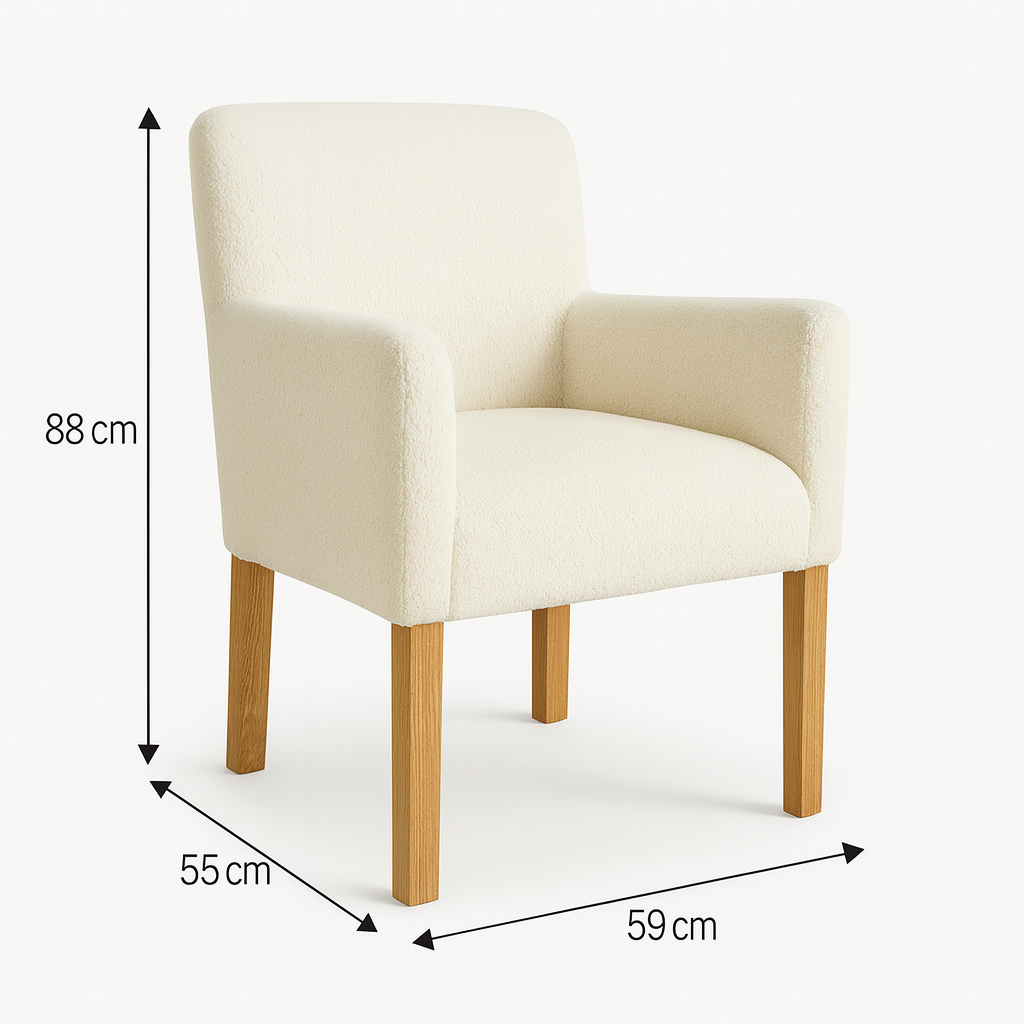 Poltrona con Brazos tapizado en tela ovejo Beige, estructura en madera natural, espuma de alta densidad, con patas en madera color natural.