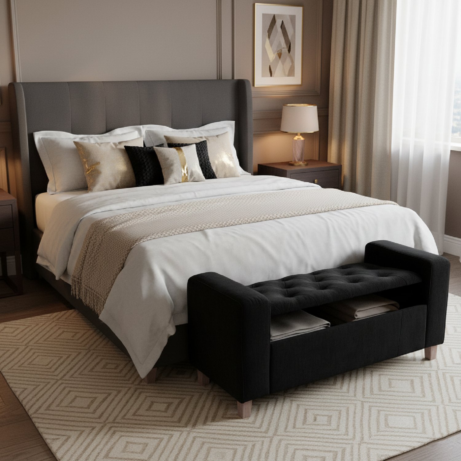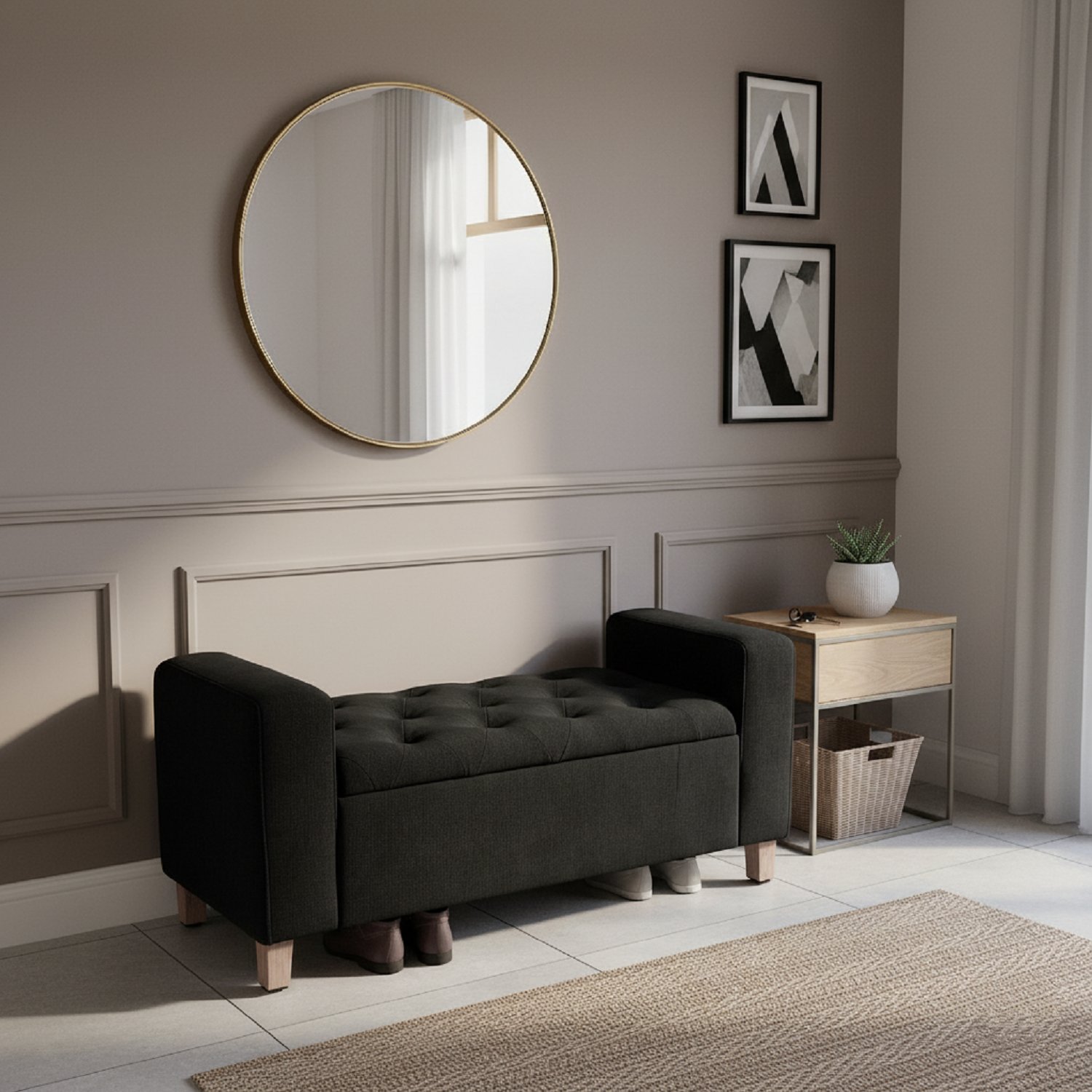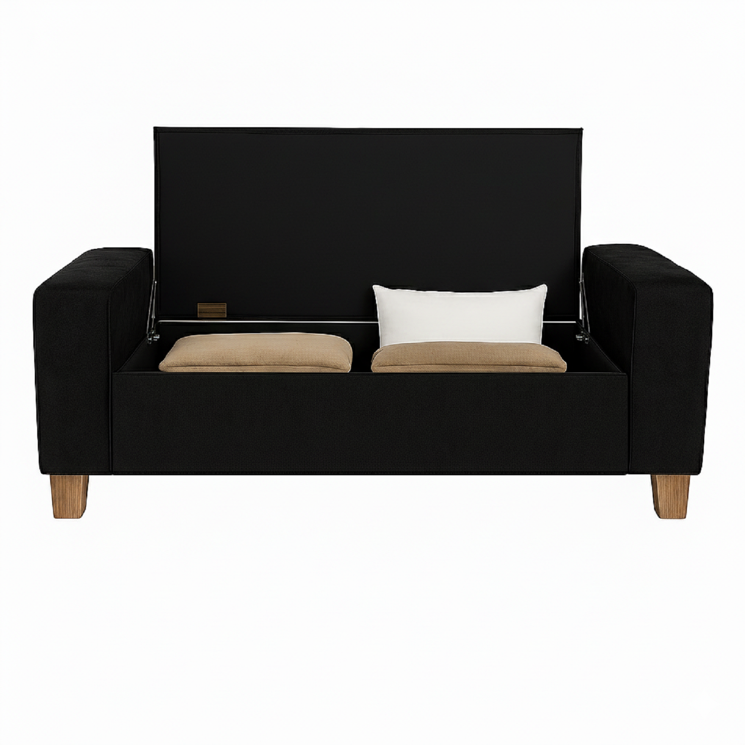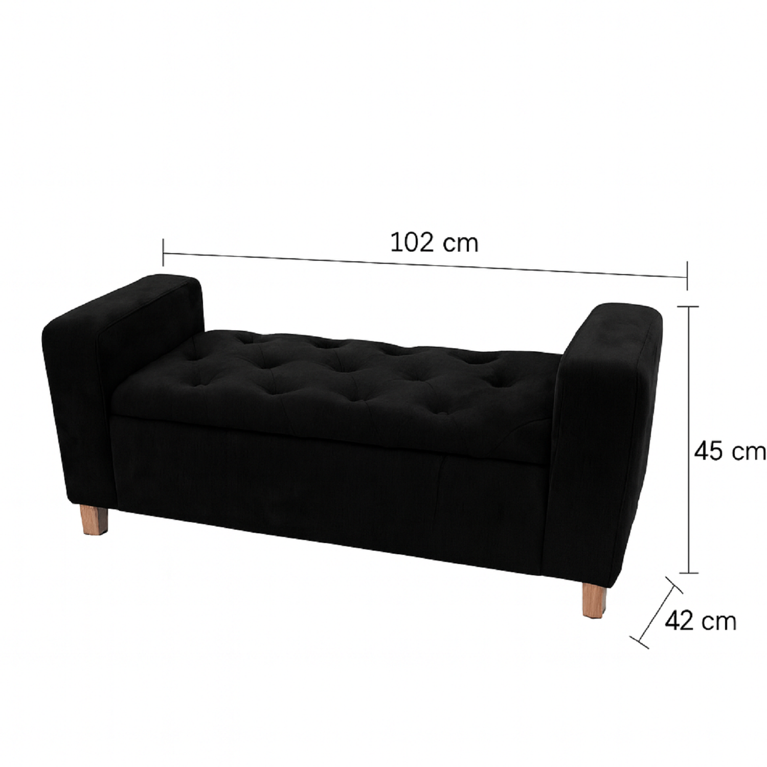 Dale un toque especial a tus espacios con este Puff Baúl tipo banqueta. Su diseño con brazos y capitoneado en color negro. Es cómodo gracias a su espuma de alta densidad y su estructura en madera natural con patas a tono le da un acabado cálido. Además, cuenta con espacio de almacenamiento para que tengas todo en orden.
