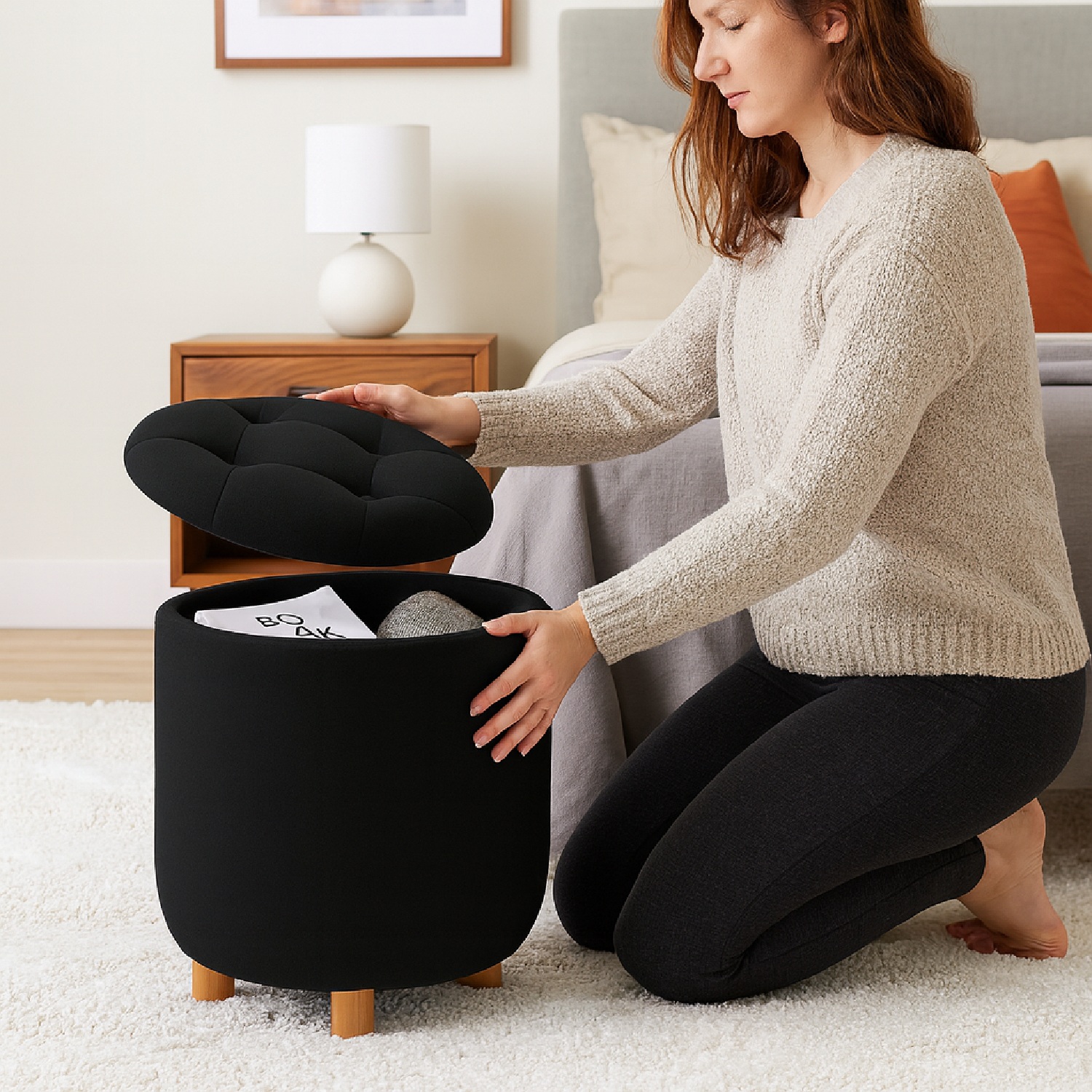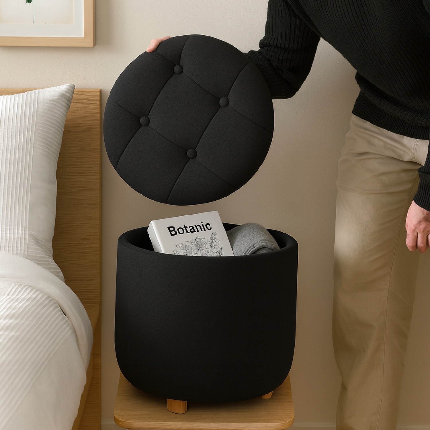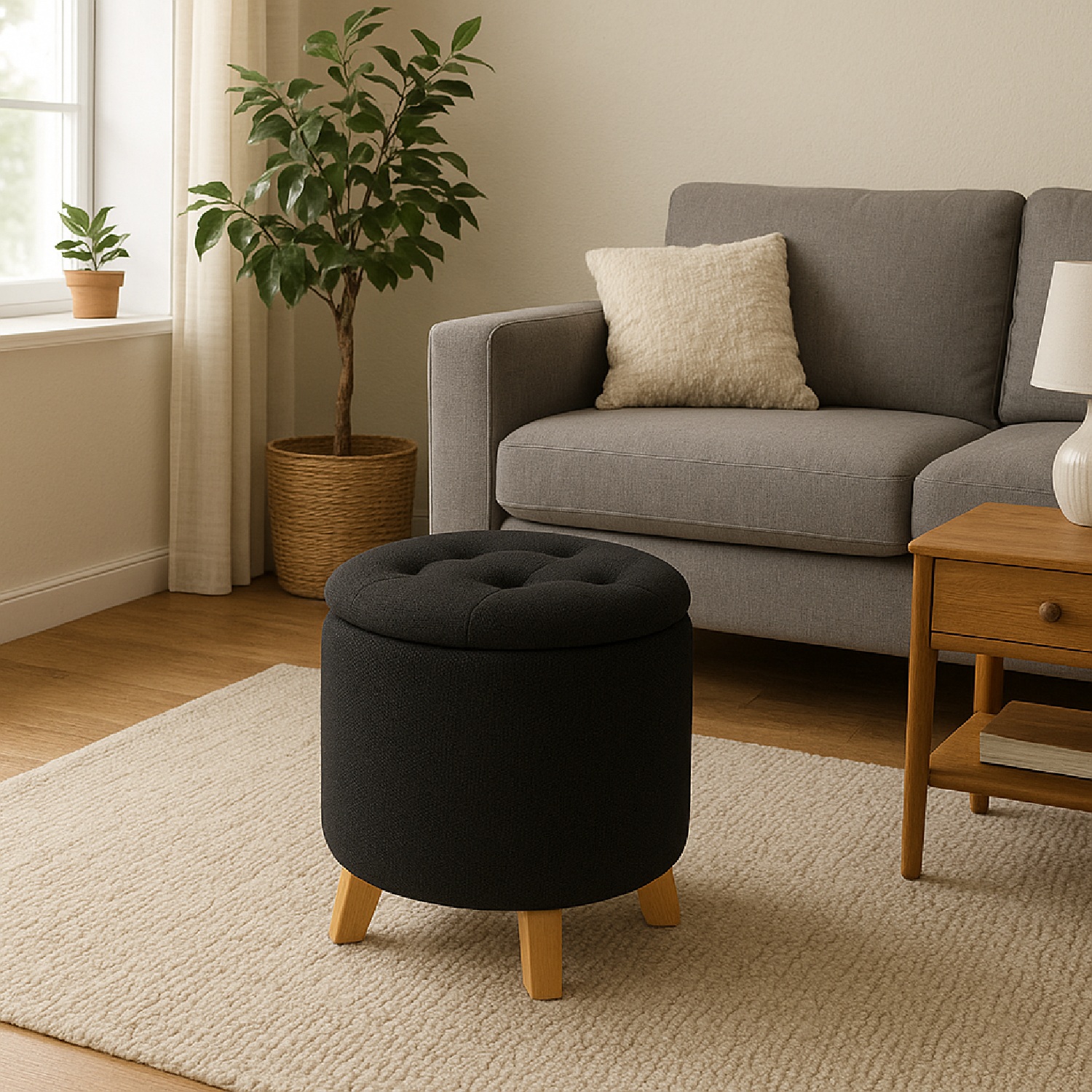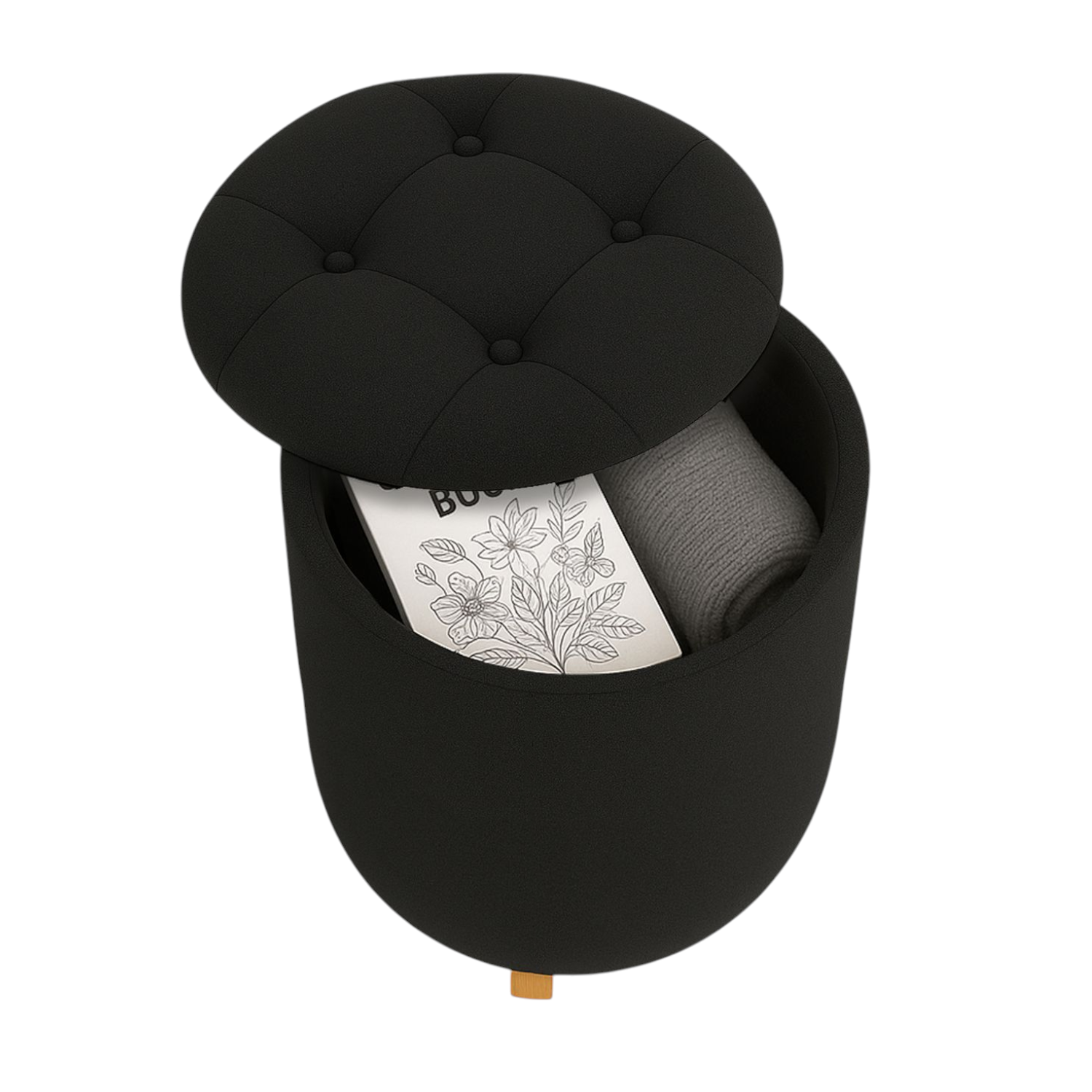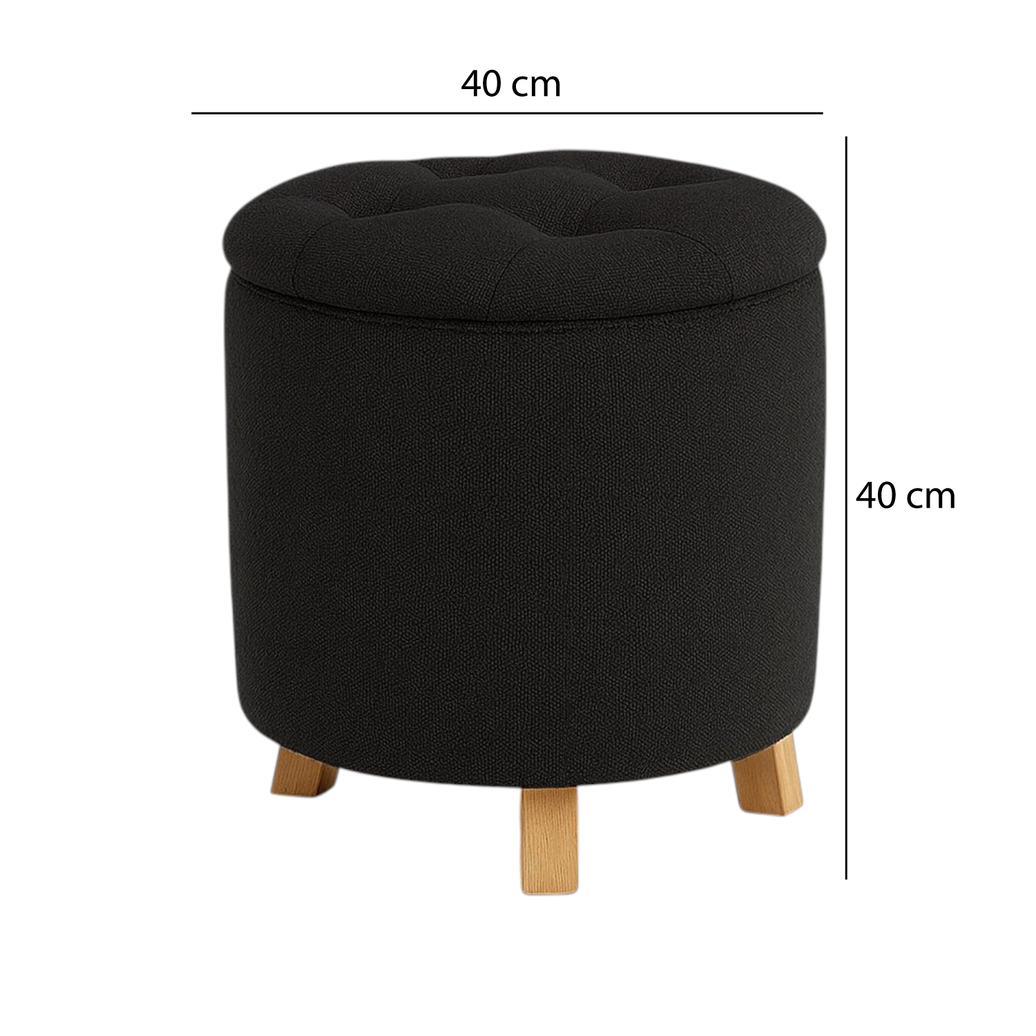 Puff baúl capitoneado Negro, 4 patas. Un mueble práctico y elegante que se adapta a tu hogar. Su diseño capitoneado le da un toque sofisticado, mientras que su baúl interno es perfecto para guardar y organizar con estilo. Ideal para aportar calidez, confort y funcionalidad en cualquier espacio.