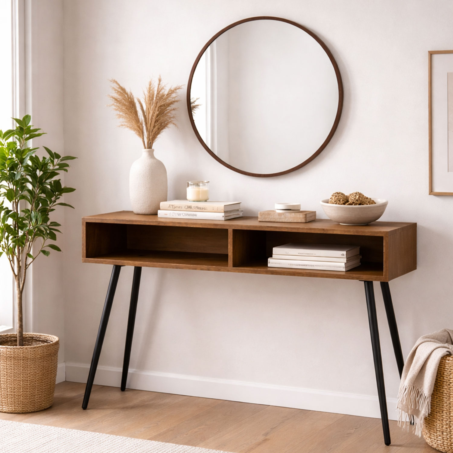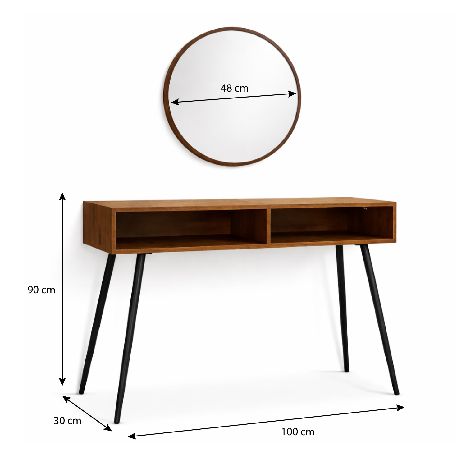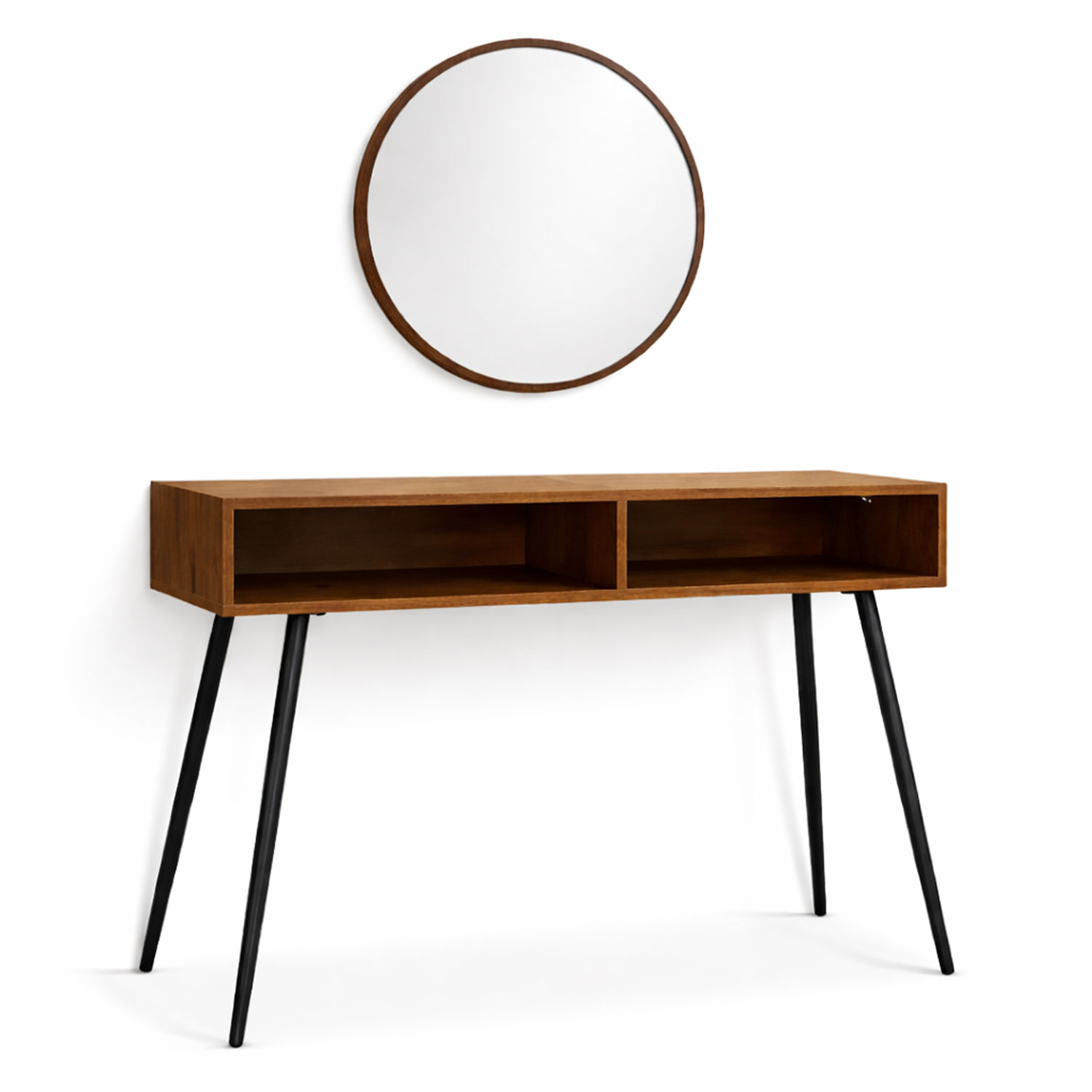 | Consola en madera con acabado natural, cajones funcionales para almacenamiento, patas metálicas que brindan estabilidad y espejo con estructura resistente que complementa el conjunto.