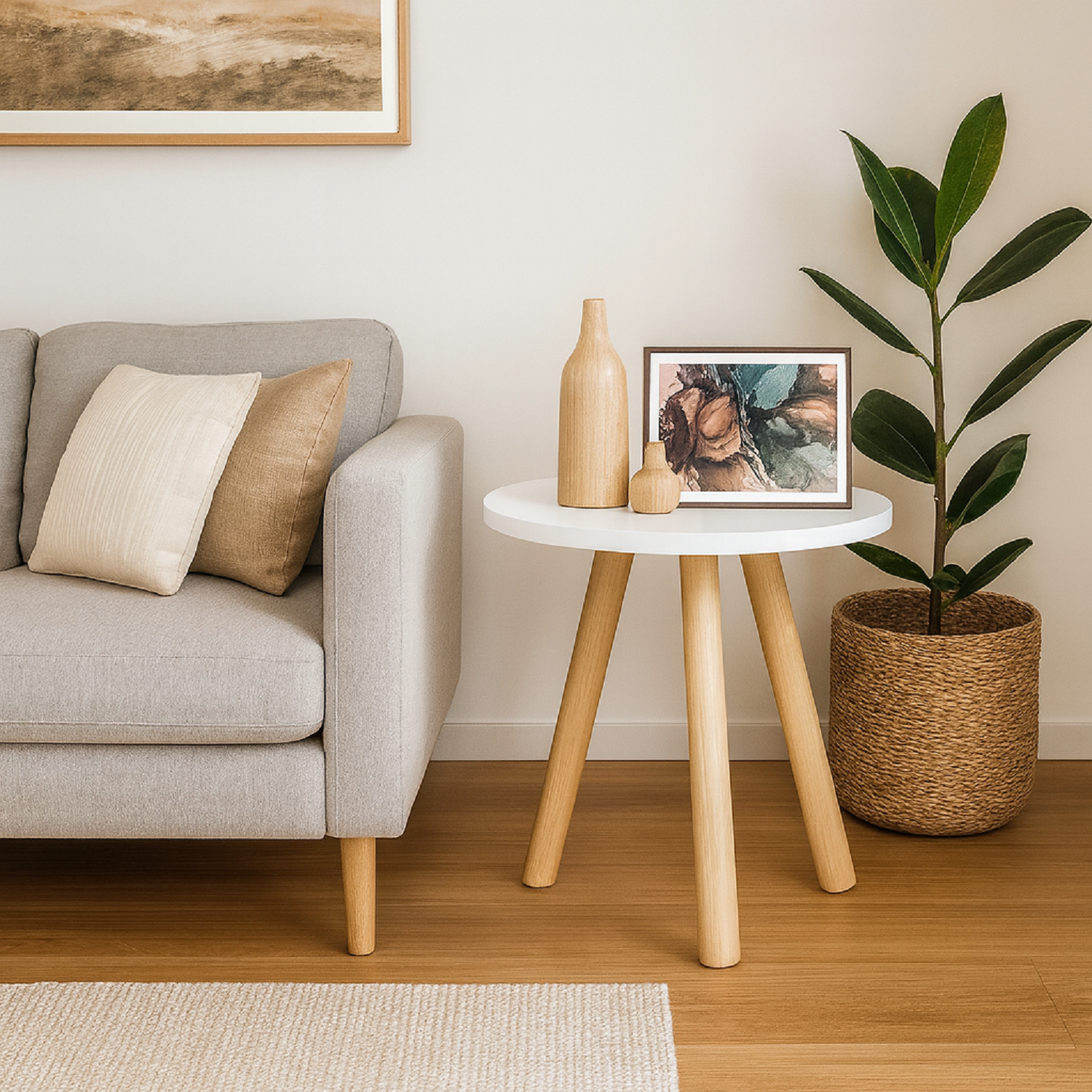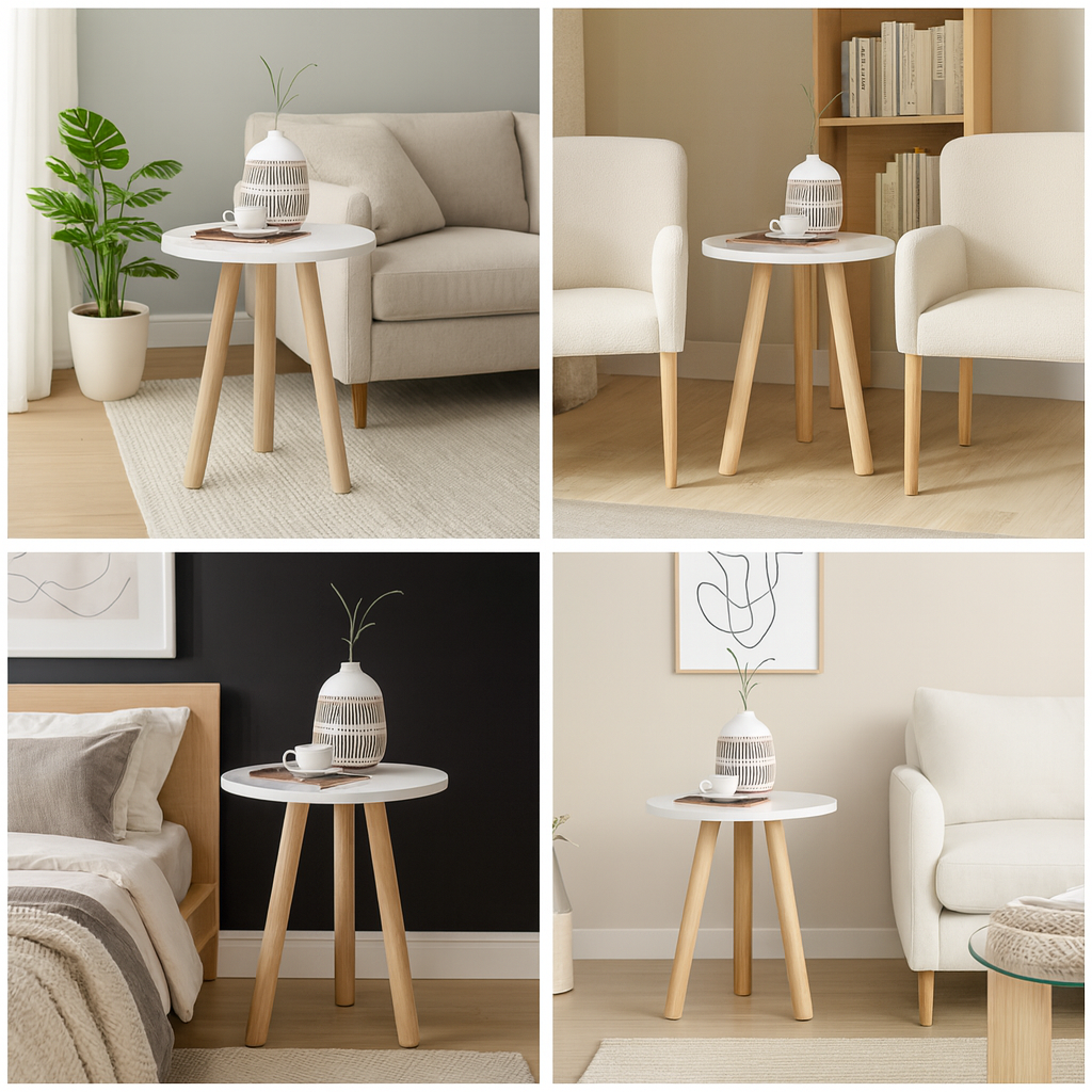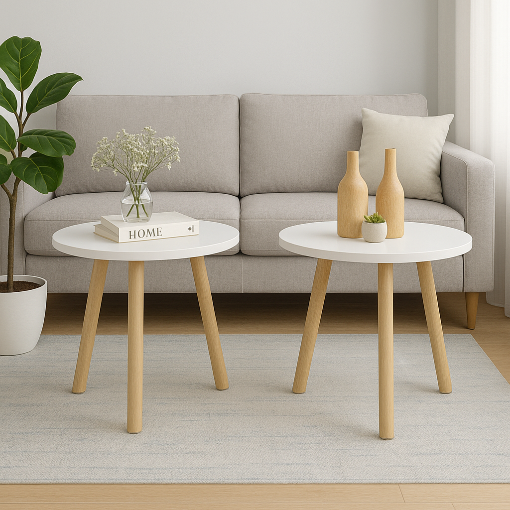 Set x 2 Mesas de Centro – Auxiliar Redonda Turku (40x40x40cm) Blanca – Mesa de centro / auxiliar blanca, Elaborada en melamina blanca con protección antimicrobiana al 99.9%, esta mesa cuenta con patas torneadas robustas de pino, que le aportan solidez y un estilo cálido y natural.