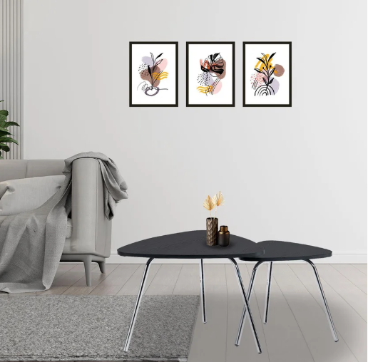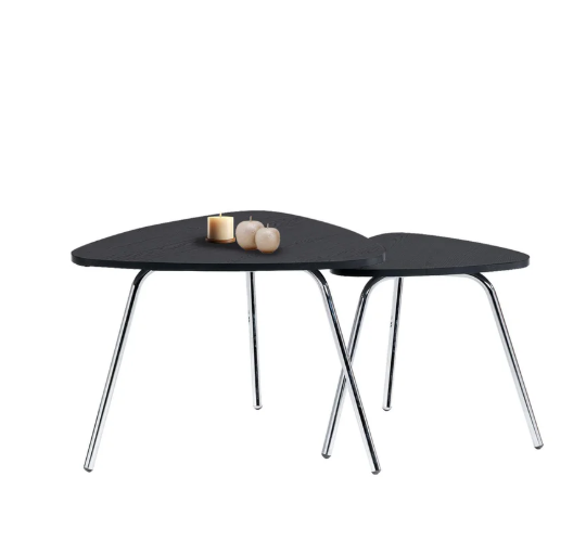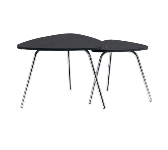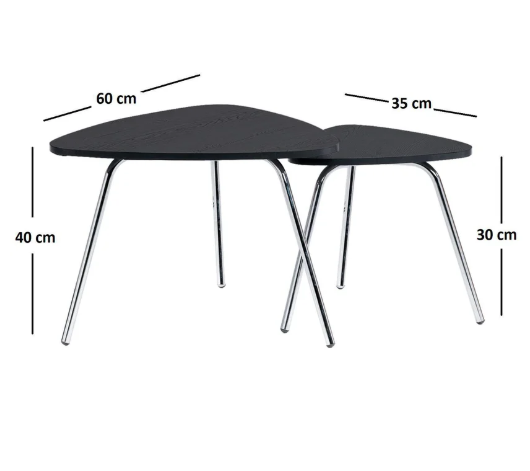Set x 2 Mesas Triangulares Moderno color negro en melamina 15 mm con protección antimicrobiana al 99.9 % y patas cromadas Sus Medidas son: Mesa de Centro Alto: 40 cm Ancho: 60 cm Largo: 60 cm Mesa Auxiliar Alto: 30 cm Ancho: 35 cm Largo: 35 cm.