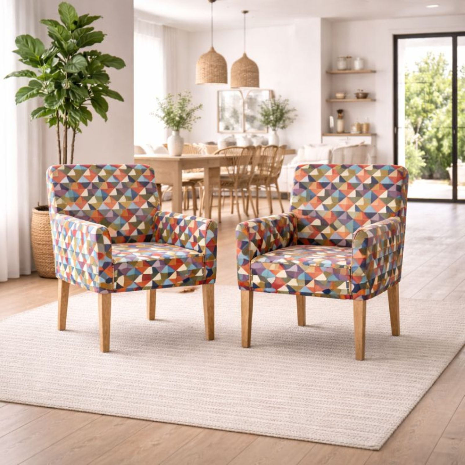Set X2 Poltronas con Brazos tapizado en tela gobelino colors, estructura en madera natural, espuma de alta densidad, con patas en madera color natural.